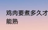 1、鸡肉煮10~20分钟左右能熟。切块的、整只的煮法和口感都不一样的,如果是饲养场的肉鸡,中等块大小的,十五分钟左右能行;如果是农家放 ....