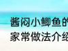 1、材料:小鲫鱼4条,大豆酱70克,花椒10粒,八角3颗,干辣椒2颗,姜3片,蒜4瓣,料酒1大匙,油盐适量。2、鲫鱼挖鳃去鳞,拽出腥线,清洗 ....